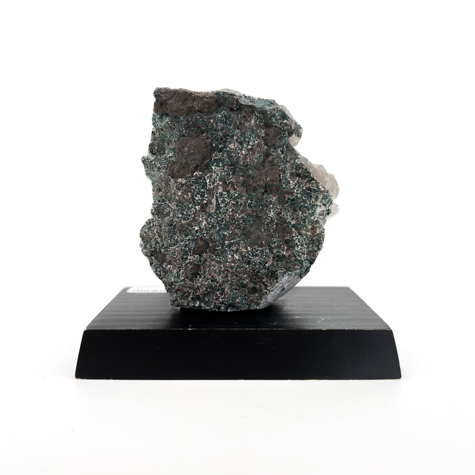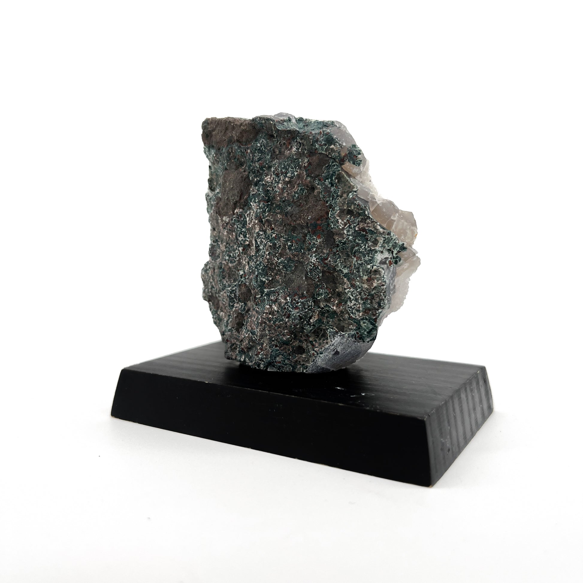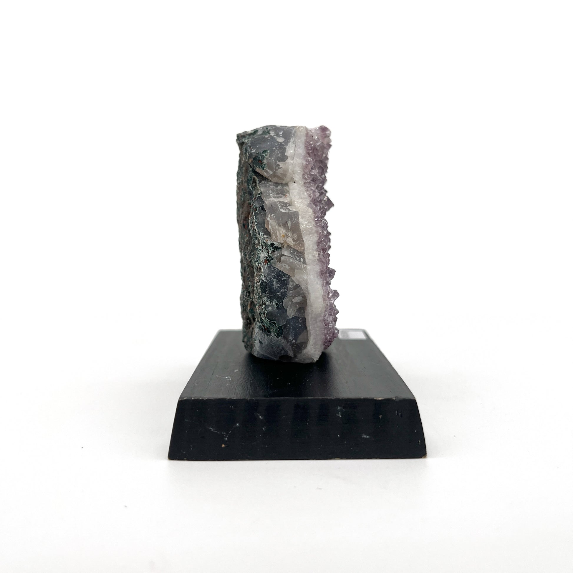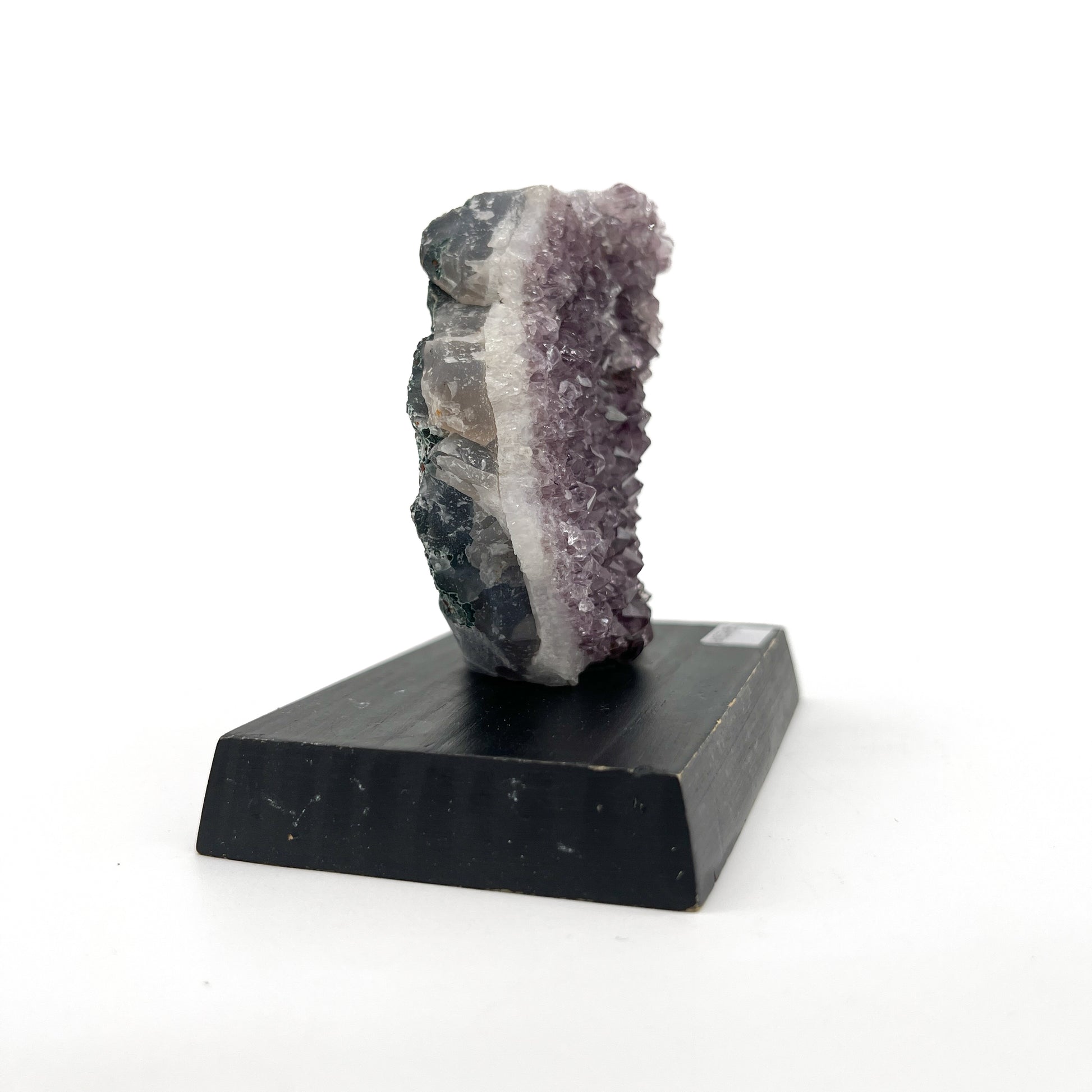 A stunning natural Amethyst crystal cluster featuring sparkling, deep purple points. The specimen is elegantly mounted on a sleek black wooden display stand, perfect for showcasing its beauty. Amethyst is renowned for its beautiful color and is a highly sought-after stone for promoting a feeling of balance and tranquility in its environment. This striking piece is ideal for enhancing home decor, meditation spaces, or adding to a crystal collection.