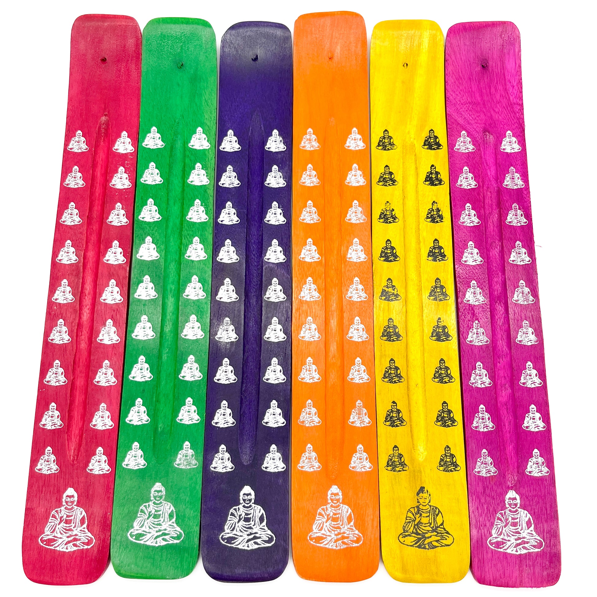 Green, purple, orange, and pink. Each holder features an elegant white Buddha pattern, adding a touch of spiritual serenity. This incense holder is not only functional but also serves as a beautiful decorative piece to inspire peace and tranquility in any setting.