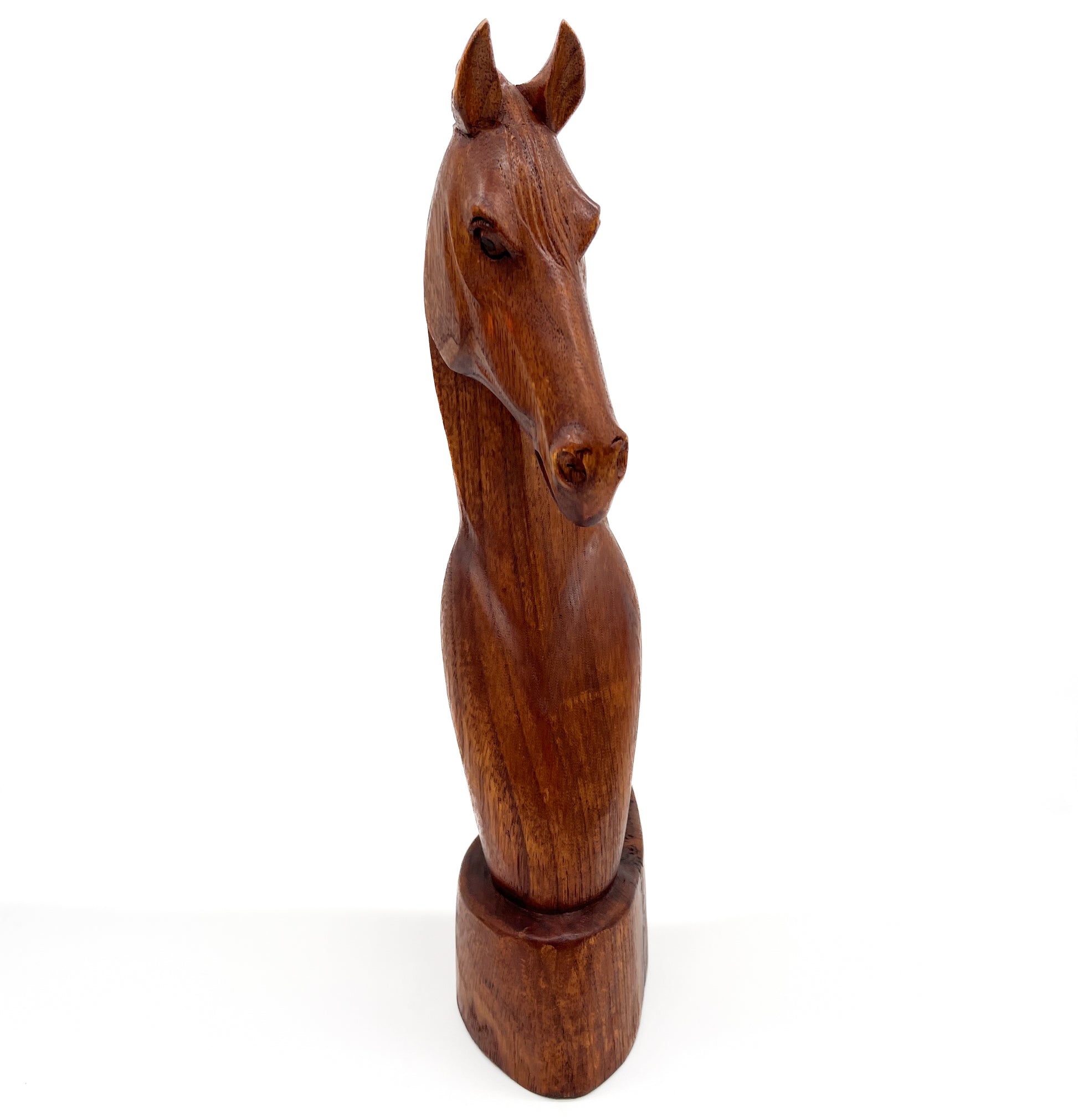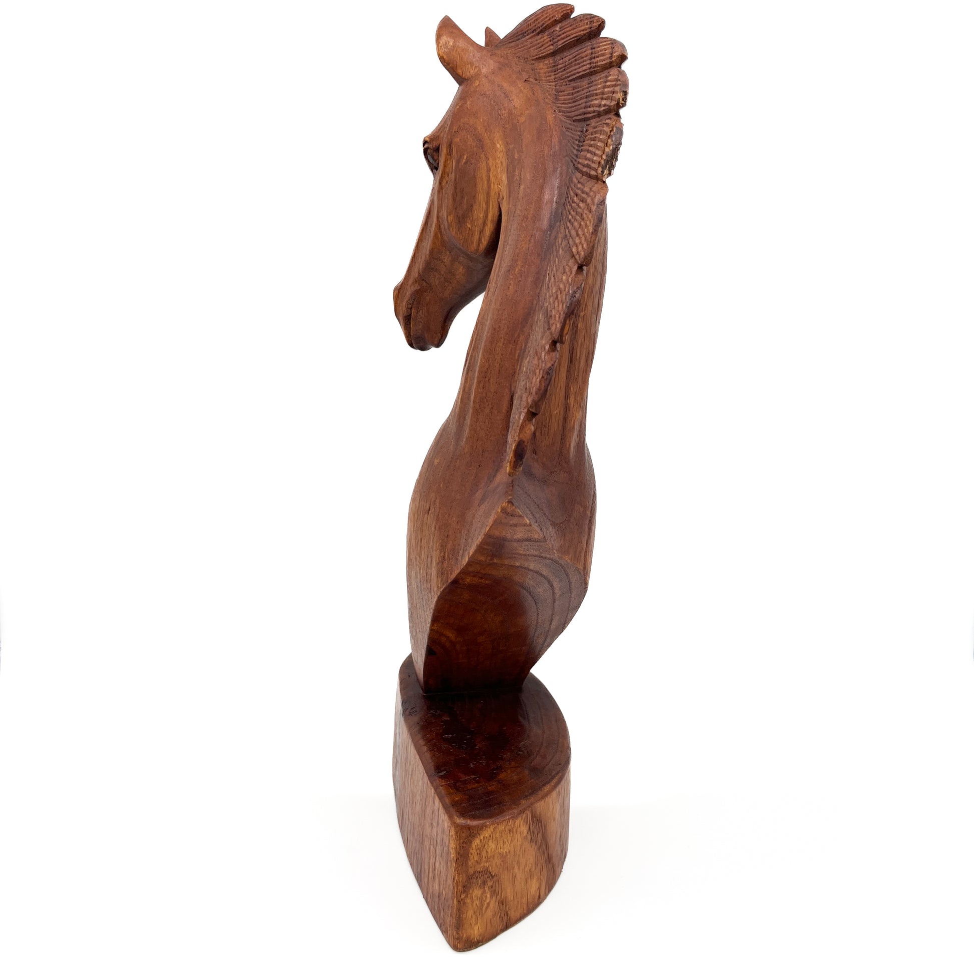 This hand-carved sculpture features a striking horse head and neck, expertly crafted from dark, polished wood. The unique bust showcases beautiful wood grain and captures the powerful, dynamic movement of the horse. Mounted on a sturdy base, this sophisticated piece is an enduring decorative accent, ideal for adding refined craftsmanship to any desk or shelf.